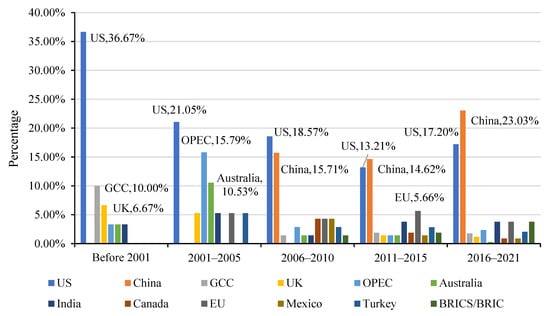 Next, we focus on the research object of the literature. Extract the names of countries or organizations from the topics, and make statistics in groups of five years to obtain the histogram shown in Figure 5. It can be seen that before the 21st century, scholars paid more attention to the situation in the United States, Gulf Cooperation Council countries, and Britain. After entering the 21st century, scholars’ research enthusiasm for the United States has not diminished. However, they no longer focus on the United Kingdom, but on the overall situation of EU countries. Since 2006, the number of publications in this field has increased sharply (Figure 1); emerging economies such as China and India have entered the research scope of scholars, especially China, which has become the largest research object in this field since 2011. In addition, after 2006, the diversity of research objects has increased, rather than focusing on just a few countries. At the same time, there are also many pieces of literature studying the situation of a group or groups of similar countries, such as oil importing countries, oil exporting countries, emerging economies, etc., or countries in the same region, such as the Middle East, Asia, South Africa, etc.