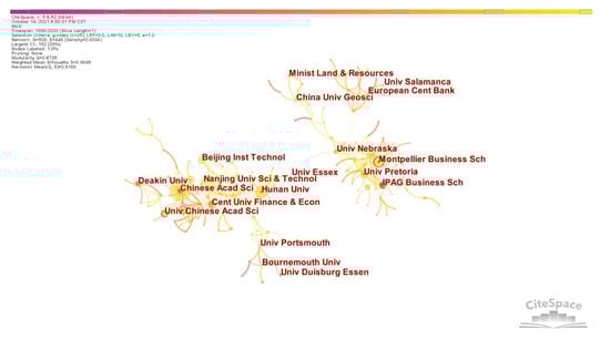 In addition, we can observe the cooperative relationship between institutions (Figure 6). The current research basically forms a cooperative network centered on the Chinese Academy of Sciences, Hunan University, and Montpellier Business School. The Chinese Academy of Sciences has a close cooperative relationship with the University of Chinese Academy of Sciences, as well as with Xiamen University and Beihang University. Hunan University cooperates with the Beijing Institute of Technology and other institutions, and this forms a sub-network. In other regions, the cooperation network centered on Montpellier Business School and on the University of Pretoria has also strengthened. This cooperation network and the cooperation network centered on Hunan University are connected through the University of Nebraska and the University of Essex.