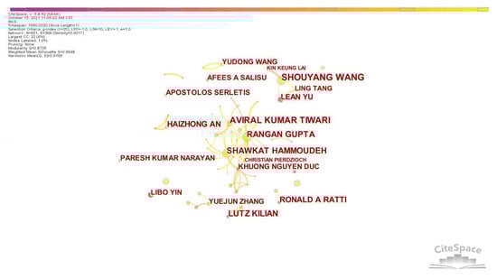 Regarding the cooperative relationship of the core authors (Figure 7), a cooperative network with Wang as the core, and Tiwari, Hammoudeh, and Gupta as another core, is formed. Wang and Lai have the closest partnership, followed by Yu and Tang. The cooperation network with Tiwari, Hammoudeh, and Gupta as the core is the largest cooperation network in the current research field.