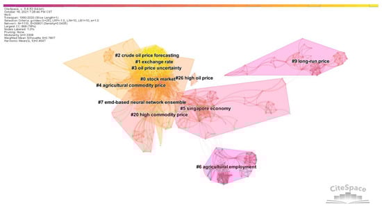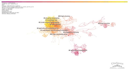 In Table 4, which depicts a summary of each cluster’s details, cluster size represents the number of articles it includes. Silhouette is a parameter proposed by Kaufman and Rousseeuw in 1990 to evaluate the effect of clustering through network homogeneity [19]. The Silhouette value lies between 0–1, and the closer it is to 1, the higher the homogeneity of the network and the higher the credibility of clustering. The publication year is the average publication time of articles in this cluster. According to Table 4, the largest clusters are Cluster #0, #1, #2, #3, and #4. Their articles focus on the exploration of the correlation between commodity prices and the stock market, the exchange rate, oil price uncertainty, and crude oil price forecasting. In addition, most clusters’ Silhouette values are above 0.7, indicating that these clusters are highly homogeneous and highly reliable.