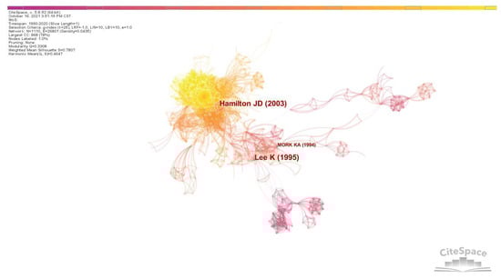 If two articles appear together in the reference list of the third citing document, these two references form a co-citation relationship. If the two documents are cited by n documents together, the number of co-citations is n times. According to co-citation analysis, the degree of correlation between documents can be measured, and the collection of documents can be classified according to the degree of correlation, after which a cluster analysis network diagram of professional papers in that discipline can be generated. In Figure 8, showing the co-citation network of sample articles, node size in the graph indicates the frequency of citations. The higher the frequency of citations, the larger the nodes. The connection between two nodes designates these two documents have been cited together. Indicating a change in the research direction, the color of the infographic changed from dark to light over the 1990 to 2020 period, and the research focus expanded from an agricultural commodity price and oil price dynamic to an oil price prediction and financialization.