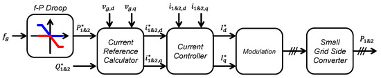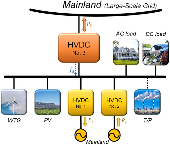 In addition, methods to ensure the stability of power supply demand and improve the system robustness by interconnecting with a large-scale grid through HVDC have been proposed [16,17,18]. Each grid is decoupled by the DC stage of the HVDC, so it is suitable for linking nonsynchronous grids, such as those for islands, over long distances. In the early days, the HVDC system was designed as a line commutated converter (LCC) type for large-scale power transmission [19,20]. However, LCC-HVDC, which requires a minimum operating capacity and a relatively long time to change the direction of power flow, is unable to cope with the volatility of massive RESs [21,22,23,24,25]. Accordingly, newly installed HVDCs adopt the voltage-sourced converter (VSC) type. With advances in semiconductor devices and control methods, a large-capacity operation is also possible for VSC-HVDC. It can change the power transfer direction faster than LCC-HVDC [26,27,28,29,30,31]. Recently, solutions for improving grid stability based on the VSC-HVDC have been studied. The frequency regulation methods using VSC-HVDC were presented [32,33]. However, the VSC-HVDC is connected with an individual RES, it is hard to stabilize the entire grid or cooperate with other grids. A stabilization approach for a large grid was demonstrated in [34]. In this case, there is a huge generational capacity of traditional power plants, and VSC-HVDCs are used to connect large-scale grids, so they are not suitable for the small-scale grid with high renewable penetration.