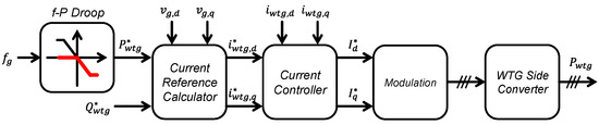 Figure 5 shows the control process of WTG. In this paper, the type 4 WTG model was used. Basically, since it is a variable wind speed generator, the actuator uses the maximum power point tracking (MPPT) algorithm by controlling the pitch angle and rotor speed so that WTG can capture maximum wind energy [37,38,39]. In addition, constant power control is performed above the rated wind speed. In general, PMSG is connected to the grid through a full-converter. The grid-side converter is responsible for maintaining the DC-link voltage, and the generator-side converter controls the output power [39,40]. In this paper, WTGs operate in MPPT and power adjustment modes according to the grid situation, and the mode is switched based on the grid frequency. If the grid frequency is upregulated, WTG reduces the output power by lowering the power reference until the grid frequency returns to its nominal, as depicted in Figure 5.