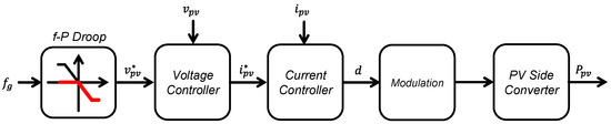 Figure 6 shows the output power generation process of the PV. In this study, since a large-capacity PV power plant was simulated, the system was configured as a two-stage system consisting of a DC/DC boost converter and a DC/AC inverter. Like other DGs, the DC/AC inverter operates to connect with the grid. The boost converter extracts the energy generated by the PV by regulating the voltage of the PV. In general, the PV converter applies a P&O algorithm to perform MPPT control [41,42,43], which adjusts the voltage to output maximum power according to the amount of irradiation and temperature. As in the case of wind power generators, depending on the grid situation, PV outputs its maximum power or cuts down the reference, as shown in Figure 6.