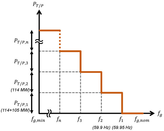 In addition, when the load is momentarily increased due to EV charging, heating/cooling load, factory load, etc., the frequency may drop sharply. The combined cycle power plant has a fast start-up ability; hence, it has been used to compensate for the varying power and improve the load flexibility [44,45,46]. Hereby, in the proposed method, the thermal power plants (T/P) provide additional power based on a predetermined frequency to contribute to grid stabilization, as shown in Figure 8. If the grid frequency descends below the predetermined value, T/Ps participate in a power supply in order until the grid frequency recovers. In T/P1, as illustrated in Figure 1, a generator of 114 MW starts-up at 59.95 Hz and 59.9 Hz, respectively, and in T/P2, a generator of 105 MW begins to operate at 59.95 Hz, which is given by Equation (9). n is the number of power plants.