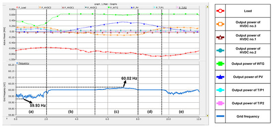 Figure 11 describes the operation result of the Jeju Island grid during normal operation without sudden changes in load or power generation or accidents. In (a), both WTG and PV showed low power generation. Since the power demand exceeds the amount of power generated by RESs, it can be confirmed that power is supplied from the mainland through HVDC no. 3. Where is larger than 130 MW, the grid frequency was adjusted downward, and accordingly, HVDC no. 1 maintained minimum operation and the output power of HVDC no. 2 increased. The grid frequency decreased to about 59.93 Hz, and T/P1 and T/P2 were started to participate in power supply and frequency recovery. As a result, dropped below and the grid frequency returned to nominal, as shown in (b). In this division, wind speed and irradiation increased, and and rose. At about t = 3 s, the WTG began to produce its maximum output. also increased gradually, and the power generation of RESs exceeded the load from t = 4.8 s. The excess power was transmitted to the mainland through HVDC no. 3. Since did not go below , the grid frequency was maintained 60 Hz. Accordingly, T/Ps remained in a stand-by state, and HVDC no. 1&2 delivered only the minimum capacity. In (c), because reduced below , increased as expressed in Equation (12), and the grid frequency immediately upregulated. Thus, as shown in Figure 9, decreased, and and were cut down. Contrary to (a), HVDC no. 2, T/Ps maintained the minimum output, and rose and the excess power was transmitted to the mainland. In (d), the load ascended and descended, so HVDC no. 3 changed the power transmission direction from reverse to forward. In this period, was between and , so the grid frequency was fixed at 60 Hz. In (e), becomes larger than , so HVDC no. 3 lowers the grid frequency, and and rose accordingly.