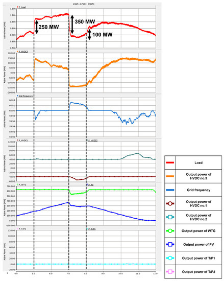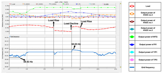 At t = 5 s, the grid frequency was kept within approximately 59.97 Hz, as described in Figure 14. Therefore, HVDC no. 1 maintained the minimum, and the output power of HVDC no. 2 did not change significantly. RESs continued to perform MPPT, and T/Ps did not develop. At t = 7 s, as the load decreases, the supply momentarily exceeds the demand, and the frequency rises. However, as increased, and and lowered, the grid frequency returned to nominal within about 1.2 s. After t = 8.2 s, every result showed the same as Case 1, as shown in Figure 11.