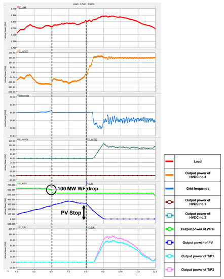 Figure 15 shows the response of each source in the situation where the RES abruptly stops. The 100 MW wind farm (WF) dropped out at t = 6 s, and the whole PVs stopped gradually from t = 8 s. Although the output power of RESs was drastically reduced, HVDC no. 3 covered it through the forward power transfer. The grid frequency fell, and , , and were raised. Despite the large-scale shutdown of the RES, the required power was supplied to the load by the other DGs, and the grid frequency was between 60.61 Hz and 59.89 Hz. Figure 16 shows the enlarged part of t = 4–12 s. When 100 MW WF was dropped (t = 6 s), HVDC no. 3 changed the output from −40 MW to 60 MW and supplied power to the load instead of WF. After that, PV stopped at t = 8 s. At this moment, further increased. As soon as crossed , the grid frequency was decreased, but did not go below 59.8 Hz until the end of the simulation. Because of the grid frequency drop, ascended, and at t = 8.5 s, the frequency went below 59.5 Hz, so T/Ps began to generate power, as shown in Figure 16. As RES, which accounts for a high proportion of power generation, was eliminated significantly, HVDC no. 3 continued to absorb electricity from the mainland. Therefore, after t = 8.4 s, was always greater than , and the frequency was not restored to 60 Hz. However, as mentioned earlier, it did not go below 59.8 Hz and stayed around 59.5 Hz, as depicted in Figure 16. In addition, since there is a reserve in the capacity of HVDC no. 3, HVDC no. 2 and T/Ps, they can continuously supply power to the load without any issues.