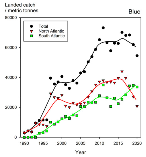 - ICCAT. Report of the Standing Committee on Research and Statistics (SCRS). In Proceedings of the Standing Committee on Research and Statistics (SCRS), Online, 27 September–2 October 2021. Available online: www.iccat.int/Documents/Meetings/Docs/2021/REPORTS/2021_SCRS_ENG.pdf (accessed on 4 December 2021).