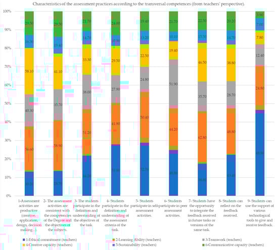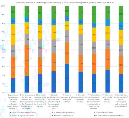 In the first place, if the nine characteristics of good assessment practice are analyzed (in the sense of training, participation by the participating students, transparency), sustainability is once again the transversal competence least linked to all the characteristics. In fact, when asked about the characteristics of good assessment practice, all of them were very weakly linked to the development of the sustainability competence (with an average of 10.4%). Sustainability does not appear as a competency aligned with learning objectives or the object of formative assessment practices, suggesting that there is still a long way to go in terms of teaching and learning this competency.