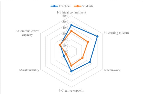 On the other hand, the teachers indicates that 7—Works and projects is the strategy with the greatest degree of utility for the development of the transversal competence of sustainability, with 30.2% (15.5% by the participating students). This characteristic is where the greatest discrepancy is evident between the perspective of the teachers and the participating students with a difference of 14.7 points, followed by 12—Portfolio or Learning Folder (11.1 points), scored as more useful by teachers.