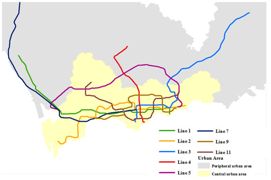 Smart card records were collected in Shenzhen, a modern city that serves as a window for China’s reform and opening-up policy. In the last 40 years, Shenzhen has blossomed into one of the most important financial, manufacturing, and technological centers in China, attracting numerous migrants to work in this city. Luohu, Futian and Nanshan district formed the central urban areas, concentrating a large number of jobs in this city. The remaining districts and eastern suburbs formed peripheral urban areas. Due to the abundance of cheap residential areas in the peripheral urban area, a large amount of subway commuting occurs between the peripheral urban area and the central urban area. In 2004, Shenzhen built its first-ever subway line, i.e., the east portion of Line 1. To meet the needs for urban development, the subway system network in Shenzhen was established in 2011, which opened five subway lines (including Line 1 West, Line 2, Line 3, Line 4, and Line 5). The other three subway lines (Line 7, Line 9, and Line 11) had been built late in 2016 (Figure 1).