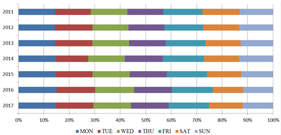 Figure 3. The proportion of trips over the day of the week (2011–2017).