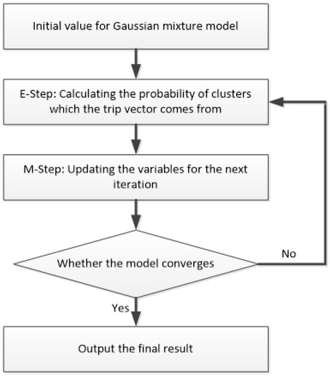 The iterative calculation in the E-step and M-step continues until the model converges. The workflow for GMM clustering is presented in Figure 4. According to the final result, each trip vector could be trained to test the corresponding probability for all cluster centers and finally allocated to the appropriate cluster.