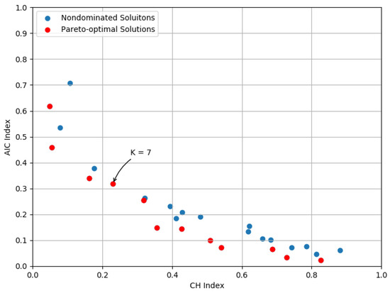 However, in the majority of cases, the performance of the same cluster number on these two evaluations may be self-contradiction, because more clusters always enhance the information expression and reduce the sensitivity among cluster features. To balance the evaluation indexes of the two methods, we introduced the Pareto principle to extract the solution set in a multi-objective decision [46]. For the multi-objective decision of parameter choice, two objective functions are organized as f   * ( x ) for minimization over cluster number solution x, shown as: