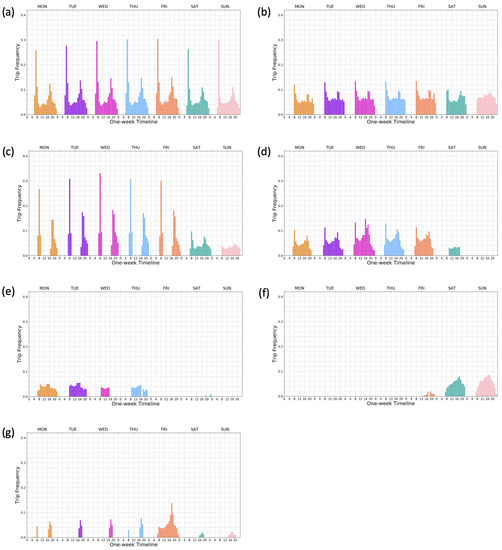 Figure 7. The configurations of travel behaviors in clusters 1–7. (a) Temporal profile of cluster 1: 549,327 passengers (2.9%); (b) temporal profile of cluster 2: 2,239,660 passengers (11.8%); (c) temporal profile of cluster 3: 3,798,313 passengers (20.0%); (d) temporal profile of cluster 4: 2,234,894 passengers (11.8%); (e) temporal profile of cluster 5: 2,825,129 passengers (14.9%); (f) temporal profile of cluster 6: 4,521,905 passengers (23.8%); and (g) temporal profile of cluster 7: 2,772,880 passengers (14.6%).