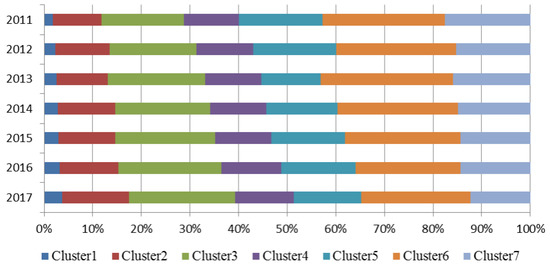 Figure 8. The proportion of passengers over clusters (2011–2017).