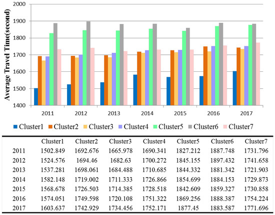 Figure 9. The average travel time of passengers in each cluster (2011–2017).