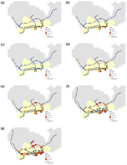 Figure 10. Spatial distribution of daily station volume for cluster 1 (2011–2017). (a) cluster 1 in 2011; (b) cluster 1 in 2012; (c) cluster 1 in 2013; (d) cluster 1 in 2014; (e) cluster 1 in 2015; (f) cluster 1 in 2016; and (g) cluster 1 in 2017.
