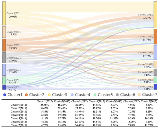 Information on each passenger’s ID is embedded in smart card data, therefore we can find out which cluster each passenger belongs to each year. As a result, the cluster migration of each individual passenger can be tracked over years. Figure 11 delineates the cluster transition matrix between 2011 and 2017. In the Sankey diagram, the order of clusters on both sides is ranked by the proportion of passengers in the respective years.