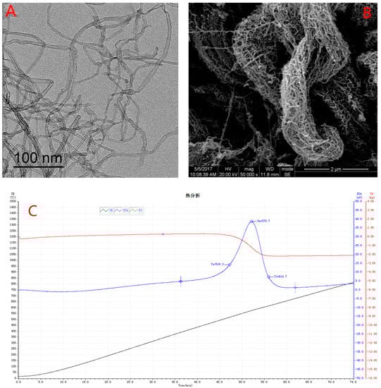 The MWCNTs were characterized qualitatively and quantitatively with TEM and SEM images (Figure 1A,B) and TGA (Figure 1C). The outer diameter of MWCNTs was 5~15 nm, the length was 10~30 μm, the purity was over 95%, the ash content was below 3% wt, and the specific surface area was 220–300 m2 g−1.