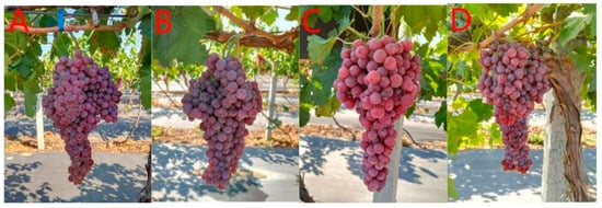 “Flame Seedless” during harvest. The concentrations of (A–D) sprayed multi-walled carbon nanotubes were 25, 50, 100, and 0 mg L−1, respectively.