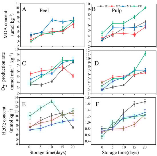 The O2− production rates in the peel and pulp tissues are shown in Figure 3C,D. The O2− production rate in peel and pulp rose gradually with increasing storage time. In the peel, the O2− production rate of the M1 treatment was low. On the 15th day of storage, the O2− production rate of the M1 treatment was lower than that of other treatments and was 33.06% lower than that of the control treatment. At the end of the storage period, the O2− production rate of the M2 treatment decreased sharply, which was 34.22% lower than that of the control treatment. In the pulp, the O2− production rate of the M1 treatment increased slowly. At the end of the storage period, the O2− production rate of the control treatment was higher than that of all other treatments, which were 1.64, 1.77, and 1.60 times that of M1, M2, and M3, respectively.
