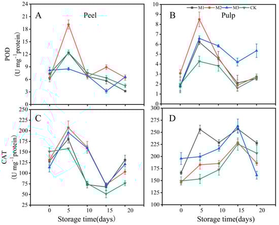 The variation trend of CAT activity differed in the peel and pulp (Figure 4C,D). The CAT activity in the peel increased sharply in the first 5 days. The CAT activity of each treatment peaked on the 5th day. At this time, the CAT activity of the M2 treatment was higher than that of the control treatment and then began to decline. From the 10th day to the end of the storage period, the CAT activity of the M2 and M3 treatments was always higher than that of the control treatment (Figure 4C). On day 10, CAT activity of M2 and M3 was 2.12 and 2.09 times that of the control treatment, respectively. At the end of the storage period, the CAT activity of the M1 treatment was higher than that of the control by 41.82%. In the pulp, by contrast, the CAT activity of the M1 treatment was always above that of the control treatment throughout the storage period. The CAT activity of the M3 treatment was higher than that of the control during the first 10th day of storage, while the CAT activity of the M2 treatment was higher than that of the control treatment only on the 5th day.