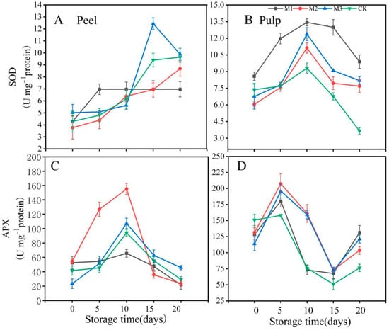 In the peel, the APX activity of the M2 treatment was higher than that of the control in the first 10 days of storage. At its peak, it was 39.35% higher than that of the control treatment. The APX activity of the M3 treatment was higher than that of the control treatment from day 5 to the end of storage. At the end of the storage period, the APX activity of the M3 treatment was higher than that of the control treatment, which was 1.73 times that of the latter. By contrast, APX activity in the pulp peaked on day 5 for all treatments (Figure 5D). From the 5th day to the end of the storage period, APX activities of M2 and M3 treatments were higher than that of the control treatment, and at their peak, they were 17.38% and 19.11% higher than that of the control treatment, respectively.