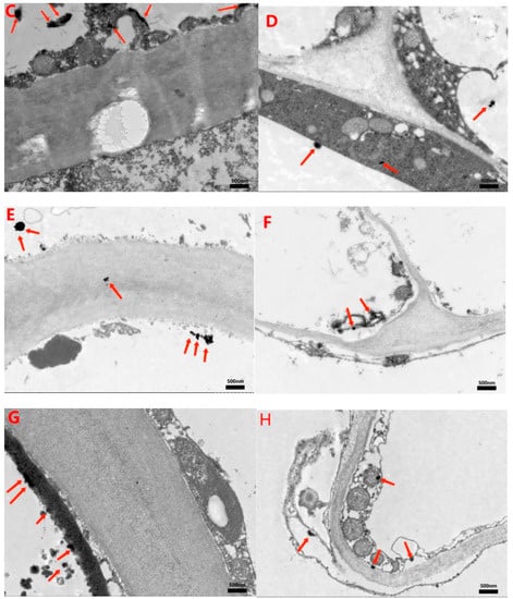 TEM images of the peel (C,E,G) and pulp (D,F,H) on the day of harvest after the grapes were sprayed with MWCNTs of different concentrations. MWCNTs aggregates or bundles (marked by red arrows) were detected in the intercellular spaces. (A,B) are the TEM images of peel and pulp in the control treatment, (C,E,G) are the TEM images of grape peel treated with 25, 50, and 100 mgL−1 MWCNTs, respectively, while (D,F,H) are the TEM images of grape pulp treated with 25, 50, and 100 mgL−1 MWCNTs, respectively. The scale is 500 nm.