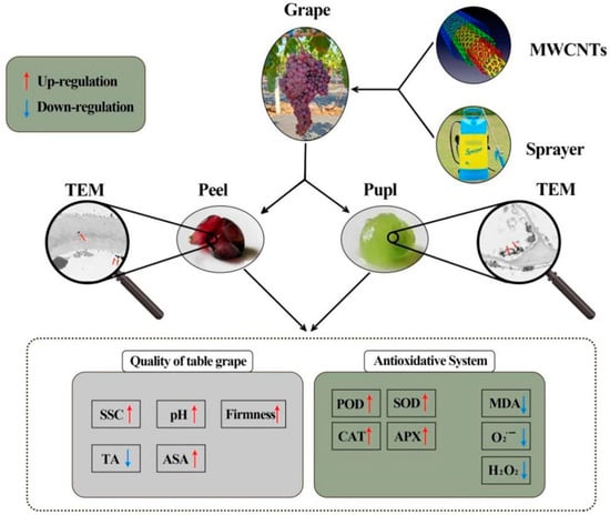 Multi-walled carbon nanotubes (MWCNTs) are one of the most commonly used nanomaterials globally [10]. Due to their unique mechanical and physical chemical properties, multi-walled carbon nanotubes have been used as potential solutions for different biologically important problems [11]. The use of multi-walled carbon nanotubes in food science has raised concerns about their biological impact [12]. Previous studies have shown that MWCNTs alter metabolic, biochemical, and physiological processes in plants including the seed germination rate, biomass accumulation including root and stem length, and activating cell division [13,14,15,16,17,18,19]. In addition, several studies have shown that the multiple effects of MWCNTs on plants exhibit a concentration-dependent form pattern. Low concentrations of MWCNTs can promote seedling growth and bio-yield of Cucurbita pepo L. [20] and tomato. Ingested and infiltrated by cells, MWCNTs enhance the antioxidant capacity by activating antioxidant enzymes such as SOD, POD, and CAT, and producing non-enzymatic antioxidants such as ascorbic acid [21]. MWCNTs can decrease ROS and malondialdehyde accumulation by activating antioxidant systems in plants [22]. MWCNTs can enhance the antioxidant capacity of the medicinal plant Khuzestanica cultured in vitro [10,23]. Previous studies on MWCNTs focused on their improvement of antioxidant capacity in plant roots, stems, and leaves, and few on their effect on fruit preservation. Improving antioxidant capacity and alleviating oxidative damage are vital for prolonging the storage period of grapes [24]. However, there is no systematic report on the preservation of grapes by MWCNTs.