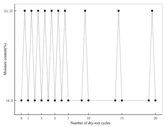 The natural loess’ in situ and saturated moisture contents were 18.9% and 24.57%, respectively. Therefore, in this paper, the dry-wet cycling process’ moisture contents ranged from in situ to fully saturated, starting from a wet state and ending in a dried form. The numbers of dry-wet cycles were 0, 1, 3, 5, 7, 10, 15, and 20 (Figure 2).