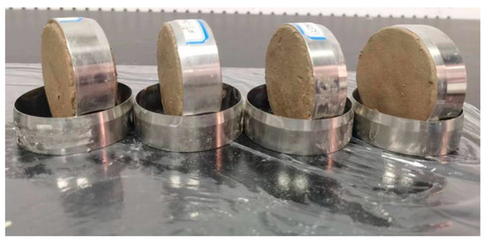 The dry-wet cycling test consisted of humidification and dehumidification steps made via a soak to saturation method. The samples prepared were assembled in the following order: permeable stone, filter paper, cutting ring sample, filter paper, and porous stone. First, seal the sample with a cling film, except for two large openings on the upper and bottom surfaces. The sealed sample was then immersed in a vessel filled with distilled water for 24 h later, assuming that the water dispersed uniformly within the test sample. Next, we dehumidified the test sample using a drying method in an electric blast drying oven at 40 °C. During drying, we monitored the sample weight at hourly intervals. For example, when the moisture content reached 20%, we weighed the sample at 10-min intervals to ensure that the moisture content achieved the value required (Figure 4).