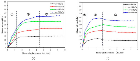 In addition, according to the shape of the stress-strain curve, they can be divided into strain-hardening and strain-softening types. The experimental results show that with the increase of mica content, the graphs of shear displacement vs. shear stress evolved from strain-hardening to strain-softening, indicating that the soil with a higher mica content improved the shear strength of soil at the initial stage of stress loading, but generally speaking, the soil possessed degraded shear strength.