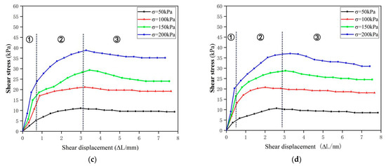 Relation curve between shear stress and shear displacement of samples with different mica content after three dry-wet cycles. (a) mica content 0%; (b) mica content 5%; (c) mica Content 10%; (d) mica content 15%. In the figure ① representative elastic deformation stage, ② representative elastoplastic deformation stage, ③ representative elastoplastic deformation stage.