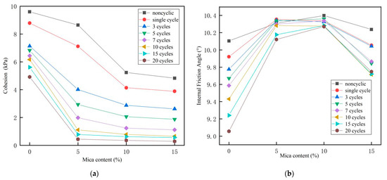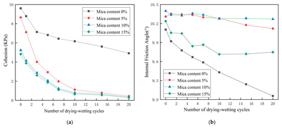 Figure 7 shows that under the condition of different mica contents, the cohesion of soil mass gradually decreased with the increase of dry-wet cycles, especially in the first three cycles. After 10 cycles, the cohesion progressively reduced to a smaller extent and tended to a constant value. This characteristic was more evident if the mica content was higher. However, with the increase in dry-wet cycles, the internal friction angle changed in different trends. When the mica content was 0%, the internal friction angle of soil decreased gradually with the increasing number of dry-wet cycles. The changing trend was approximately linear. When the mica content was 5%, the internal friction angle decreased with the rising number of cycles but was less noticeable than the soil containing 0% mica. When the mica contents reached 10% and 15%, both curves were similar, and the internal friction angles decreased slightly with the increasing number of dry-wet cycles with minor variations.