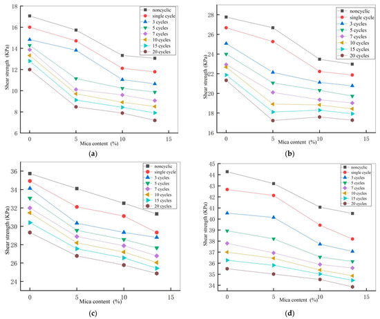 Correlation between the number of drying-wetting cycles and shear strength. (a) mica content 0%; (b) mica content 5%; (c) mica Content 10%; (d) mica content 15%.