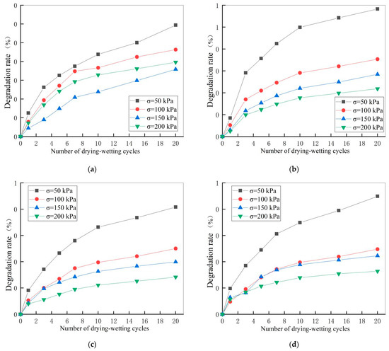 The direct shear test results show that the dry-wet cycling process and mica content had apparent degradation effects on the shear strength of loess. To further analyze the degradation trend of soil shear strength, the degradation degree of shear strength was used to represent the deterioration degree of shear strength. The degradation degree was calculated according to Equation (2). Table 7 and Figure 8 present the computed results.