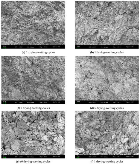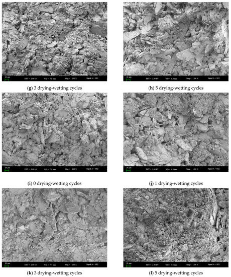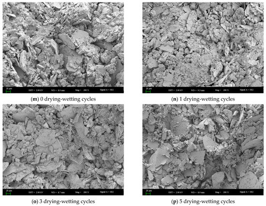 Further to the analysis mentioned above, the dry-wet cycling process had a degradation effect on the shear strength of soil samples with different mica contents and had a more significant impact on a small number of cycles and a more negligible impact under the condition of a large number of cycles. Therefore, the microstructures of soil samples with different mica contents after 0, 1, 3, and 5 dry-wet cycles were analyzed. These samples were observed with the scanning electron microscope using different magnifications (50 times, 100 times, 200 times, 500 times, 800 times, 1000 times, and 1500 times). With the magnifications of 50 and 100 times, the soil particles and pores in the images were not visible to the naked eye compared to their microstructures. In contrast, with the magnifications of 500 times, 800 times, 1000 times, 1200 times, 1500 times, and 2000 times, the soil particles and pores in the images were too large, and only a small number of soil particles and pores could be analyzed in the images, so it was not easy to comprehend the real structure of soil mass. Therefore, the magnification of 200 times was selected for the processing and analysis of microscopic morphology (Figure 11).
