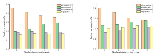 Table 8 and Figure 12 show that for loess with different content of mica under 0 cycles of dry-wet, with the increase of mica content, the content of micro-particles in loess particles decreases with an average decrease of 5.19%, while the content of large particles increases with an average increase of 3.49%, and the changes are most obvious when the content of mica increases from 0% to 5%. The variation can reach 5.26% and 4.09%. However, the change in the content of small particles and medium particles is relatively insignificant. Under the condition of a certain content of mica, with the increase of the number of dry-wet cycles, the content of micro-particles in loess particles decreases continuously, the average decrease amount can reach 11.25%, the content of small particles and medium particles increases, the average increase is 6.21% and 3.1%, the content of large particles fluctuates, but the overall trend remains increasing; these changes were most intense in the first three wet-dry cycles, this is mainly because the dry-wet cycle makes more small particles adhere to or gather around particles one or several orders larger than it, forming larger particles. The attachment phenomenon would be more evident with an increase of mica content.