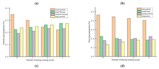 Variation statistics of soil particles in samples with different mica contents under drying-wetting cycle conditions. (a) Mica Content 0%, (b) Mica Content 5%, (c) Mica Content 10%, (d) Mica Content 15%.