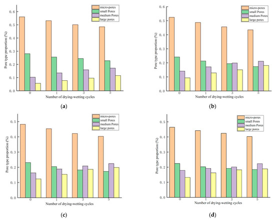 Table 9 and Figure 13 show that for loess with different content of mica under 0 cycles of dry-wet, with the increase of mica content, the content of micropores and small pores decreases continuously, with an average decrease of 3.2% and 1.89. The content of medium and macropores showed an increasing trend, with an average increase of 2.6%, and the change was most obvious when the content of mica increased from 0% to 5%. Under the condition of a certain content of mica, the content of micropores and small pores decreases with the increase of the number of dry-wet cycles, with an average decrease of 7.63% and 5.48%, respectively. The content of medium and large pores showed an increasing trend, with an average increase of 6.13% and 6.99%, and these changes were most intense under the action of the first three dry-wet cycles. The main reason is that micropores and small pores are gradually connected into medium or large pores due to the dry-wet cycle.