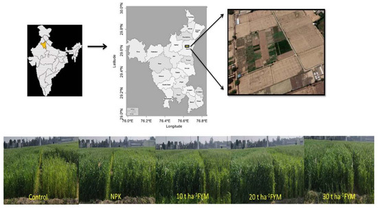 Among the organic sources of nutrients, farmyard manure (FYM) is the most commonly and easily available source in India. The application of FYM improves the soil’s organic matter and physical–chemical and biological properties, resulting in the restoration of soil fertility [6,7]. The incorporation of FYM increases the nutrient availability in the form of a wide C: N ratio, and it facilitates their slower release and improved immobilization in soil [8]. The soil organic matter (SOM) maintains the organic carbon balance to improve the soil quality and health, which leads to the sustainability of cropping systems [9,10,11]. Hence, there is a crucial need to revive the age-old practice of FYM application to maintain soil fertility and also to supplement many essential plant nutrients for enhancing crop productivity.
