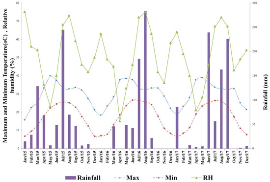 The soil of the experimental field was deep, loamy, and alluvium-derived. The soil particles distributed within the topsoil horizon (0–15 cm) comprised sand (62.4%), silt (27.5%), and clay (10.1%). The initial physico-chemical properties of the top 15 cm of soil were analyzed before the beginning of the experimentation as electrical conductivity1:2 (0.22 dSm–1), pH1:2 (8.1), organic carbon (0.38%), available nitrogen (180.0 kg ha–1), available P (14.9 kg ha−1), and available K (210.0 kg ha−1). The climate of the region is semi-arid and sub-tropical with hot–dry to wet summers (April to June), a rainy monsoon (July to September), and cool–dry winters (November to March). The average annual maximum and minimum air temperatures were 29.9 °C and 17.1 °C, respectively. The average annual rainfall of the region is 670 mm, of which 75–80% is generally received during the monsoon period (July to September). In the year 2015, a 673.7 mm rainfall was recorded in the monsoon season, while a 43.5 mm rainfall was recorded during the winter season (months of January and February). In the year 2016, a total of 627.5 mm of rainfall was recorded, while 46.2 mm of rainfall was received during the winter season (month of March). In the year 2017, the total rainfall of 93.6mm was recorded in the winter season (months of January and March). Other weather parameters recorded during the experimental years are depicted in Figure 2.