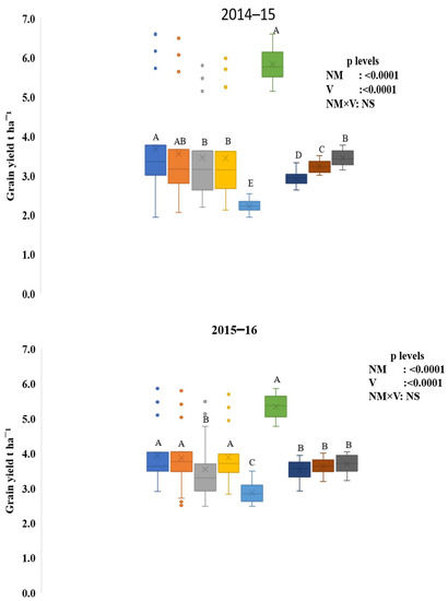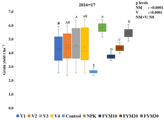 The nutrient management treatments significantly (p < 0.0001) affected the yield of the wheat cultivars during all the study years (Figure 3). The highest wheat grain yield was obtained in the NPK treatment during all three years. The NPK, FYM10, FYM20, and FYM30 treatments registered 162.7, 31.86, 45.5, and 55.3 percent higher wheat grain yields over the control, respectively, in the year 2014. The corresponding changes were 123.4, 42.6, and 66.2 percent, respectively, in 2016–2017. Though all the levels of FYM demonstrated significantly (p < 0.05) higher grain yields over the control, these produced significantly (p < 0.05) lower grain yields compared to that of the NPK treatment. It has been noted that over the years, the continuous application of FYM at 30 t ha−1 showed an increasing grain yield of wheat cultivars, and the yield difference between the NPK and the FYM30 narrowed down. In the first year of experimentation, the grain yield of wheat at 30 t ha−1 FYM level was 69.1 percent lower compared to that of NPK. In the third year, the yield gap between NPK and FYM30 reduced to only 7.2 percent.