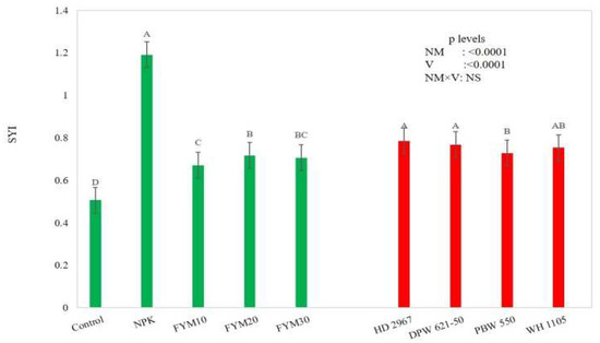 The consistently higher grain yields obtained in the NPK treatment during all the years of the study led to the highest SYI, followed by the FYM30 treatment (Figure 4). However, the performance of the wheat cultivars varied during all of the study years. Among the cultivars, HD 2967 and DPW 621-50 recorded significantly (p < 0.0001) higher wheat grain yields (3.68 and 3.56 t ha−1) in the first year of study. During the second year (2015–2016), HD 2967 (3.94 t ha−1) remained on par with WH 1105 (3.89 t ha−1), and DPW 650-21 (3.86 t ha−1) recorded the highest grain yield. During the third year (2016–2017) PBW 550 produced the highest grain yield (4.55 t ha−1), which was statistically on par with WH 1105 (4.44 t ha−1) and DPW 650-21 (4.35 t ha−1). Based on the SYI, HD 2967, DPW 621-50, and WH 1105 were observed more consistent over the years than PBW 550.