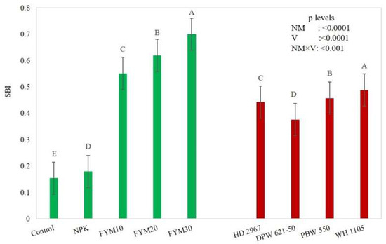 In the present study, a higher microbial population and improved soil enzymatic activity due to FYM incorporation might have resulted in a higher soil biological index (SBI values). Enzyme activities are widely used as soil biological indicators [52]. The study indicated that wheat varieties maintaining a high SBI value could be used for the improvement of soil health. The results demonstrated that key indicators play a substantial role in influencing the various soil functions. The results also indicated the importance of the bacterial population in the improvement of the SBI. A better bacterial population stimulates enzymatic activities and plays an important role in organic matter (mineralization and immobilization) transformations. The application of FYM in soil strongly influences the bacteria population in the soil, thereby indicating improved nutrient availability.