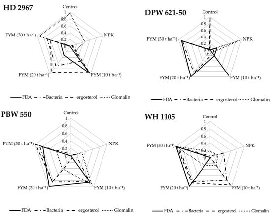 In the present study, the glomalin content was found to be significantly (p < 0.05) higher in FYM-treated soils as it is an indicator of ecological functioning and restoration involving the arbuscular mycorrhizal fungi (AMF) [34,35]. Higher glomalin content stipulates the role of FYM, which provides nutrients and increases the water-holding capacity of soil [38,39], thereby creating suitable conditions for AMF growth [40]. AMF play an important role in the nitrogen cycle as they utilize a substantial amount of N from dead and decomposed material and accumulate it in their mycelia and also transfer it to the plant roots [41]. The NPK treatment also has an adequate concentration of glomalin over the control treatment, which is due to the availability of nitrogen under the NPK treatment as it increases the AMF colonization and external hyphal growth [42,43]. In the present study, the application of FYM in all the wheat varieties favors the fungal growth, resulting in high ergosterol content (Table 5). As reported by several researchers, ergosterol is particularly present in the fungal lipid membranes and is known to be the measurement of living fungal biomass in soils [44,45]. FDA, which indicates the presence of active microorganisms as well as organic matter turnover in soil [9], was found to be greater in the treatment supplemented with higher doses of FYM. This might be because the availability of energy sources from organic matter stimulated the metabolic activity of the microorganisms present in the soil in addition to the direct addition of microbes present in FYM.