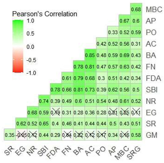 Pearson’s correlation matrix were determined to find out the interrelationship between the SBI and the important soil biological properties (Figure 9). There was a significant (p < 0.05) positive correlation of SBI with BA (r = 0.81), FDA (r = 0.78), NR (r = 0.74), AC (r = 0.73), FN (r = 0.66), SR (r = 0.65), and AP (r = 0.62). Similarly, the MBC was significantly (p < 0.05) and positively associated with BA (r = 0.69), FN (r = 0.63), AP (r = 0.67), AC (r = 0.56), and PO (r = 0.52).