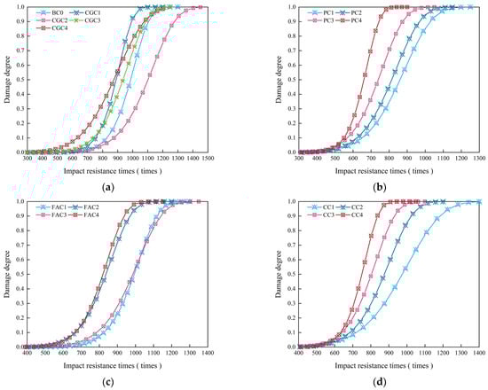 - Through the establishment of the impact damage evolution equation, the damage degradation of each specimen under drop hammer impact was studied in depth. The variation law of the data derived from the equation was highly consistent with the experimental results. The damage degradation of MLAC under dynamic load can be reasonably described by the equation.